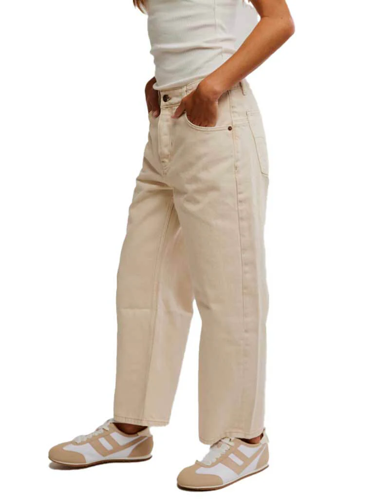 - Low-rise, dropped barrel fit